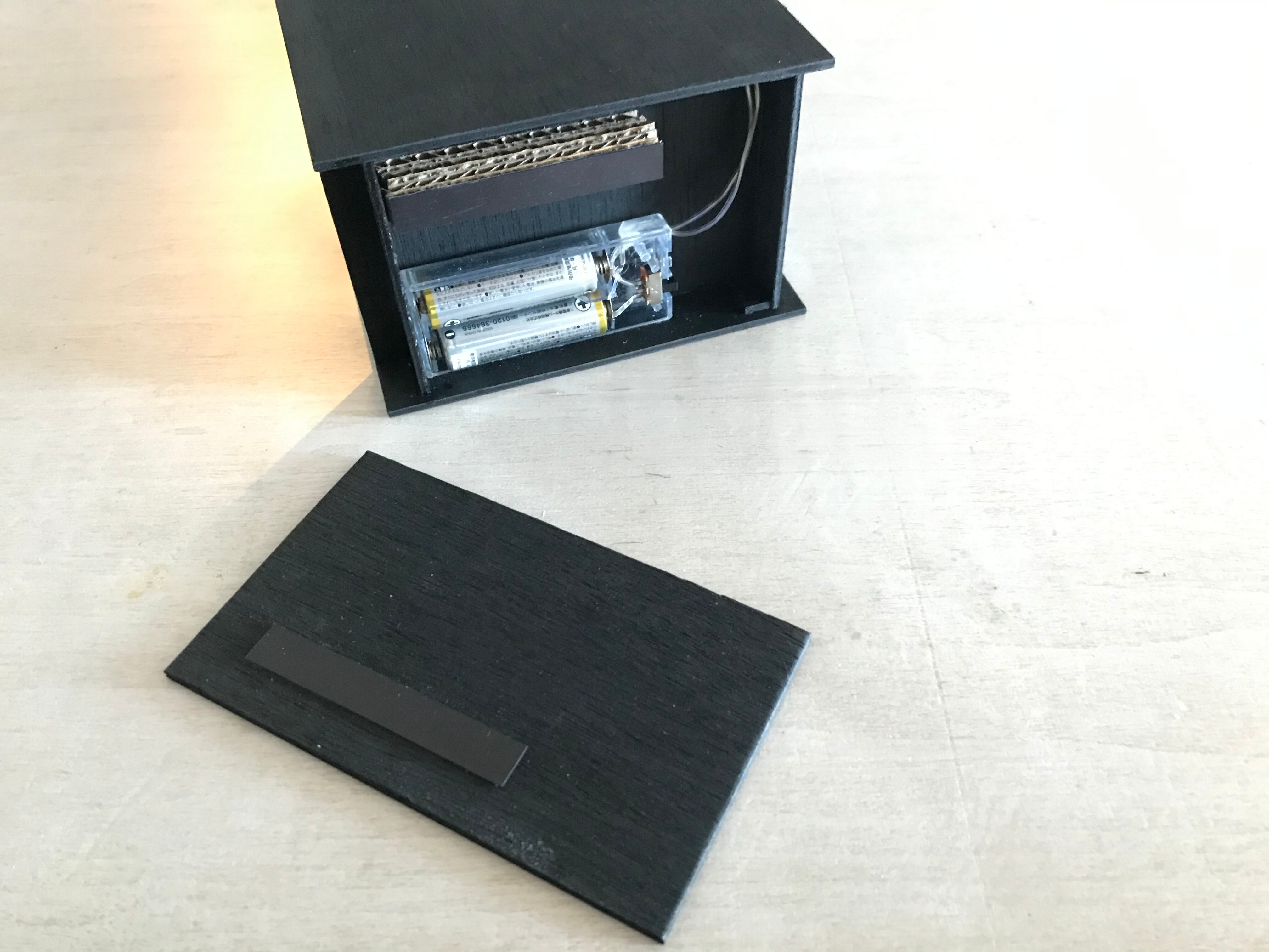天井には9台分の電球色LED(アルカリ乾電池式/単3電池2本)を設置し、ミニカー及び建物のライトアップをお楽しみいただけます。電池ボックスは側壁内に納めて、使用の際は壁の一部をあけてスイッチを入れるしくみです。